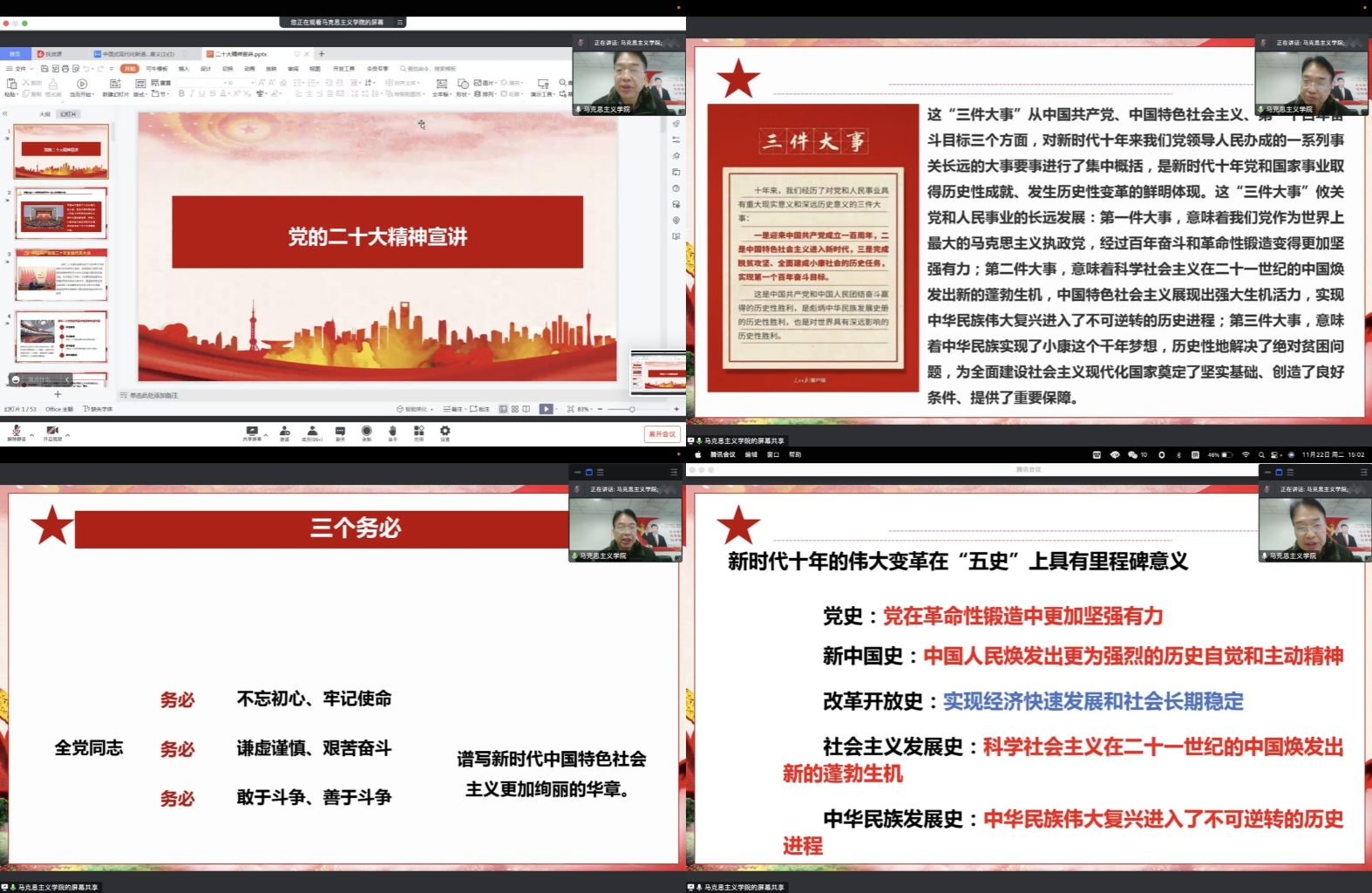 11月22日下午,文学院举办学习党的二十大精神宣讲会,邀请学校党的二十大精神专家学者宣讲团成员、马克思主义学院院长文洪朝教授宣讲党的二十大精神。此次活动采取线上形式,学院党委领导班子成员、全体教工党员、学生党员等参加了宣讲会。会议由学院党委书记陈卫东主持。